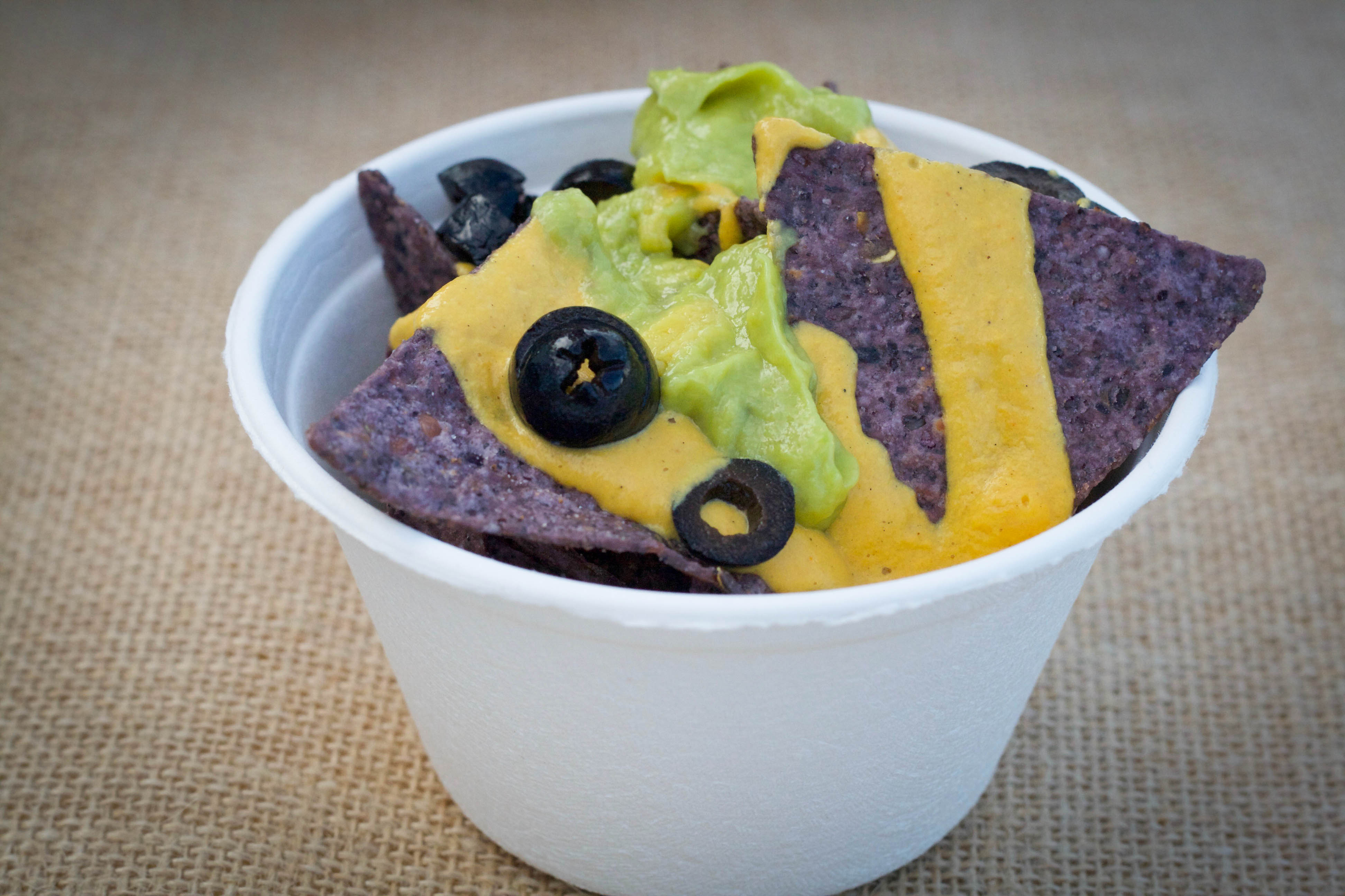 Que Pasa with Vegan Queso, Guac and Olives