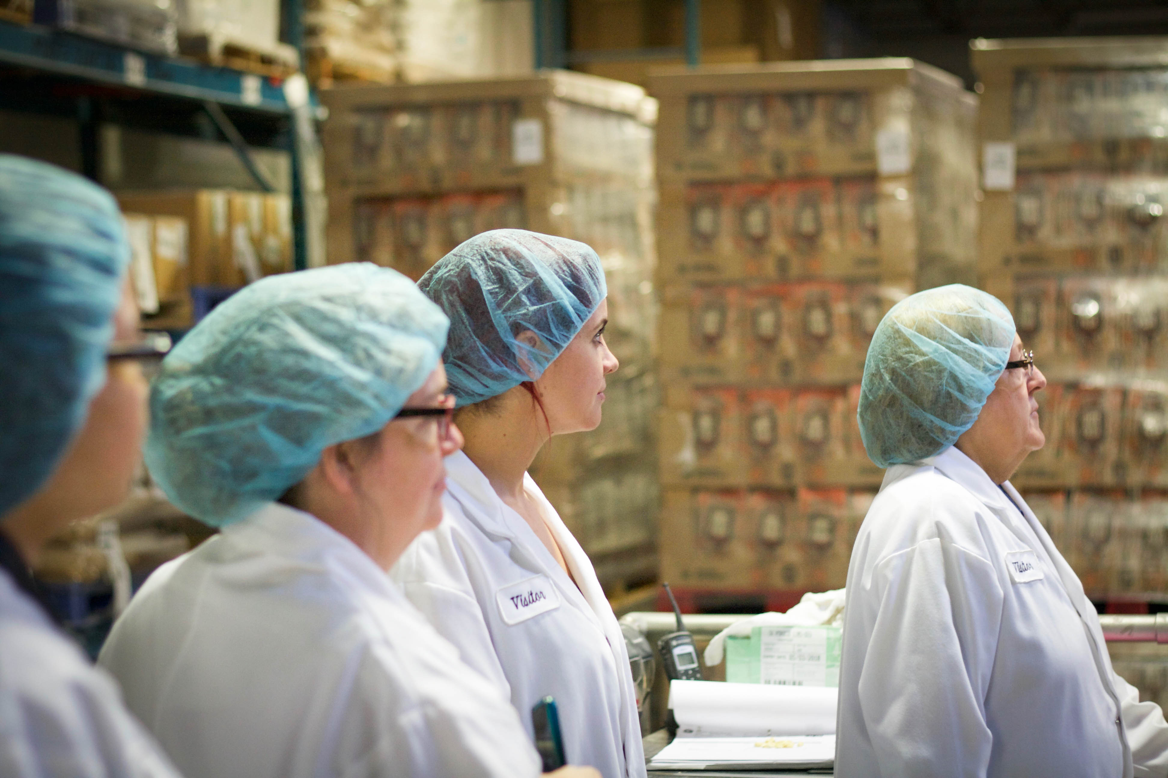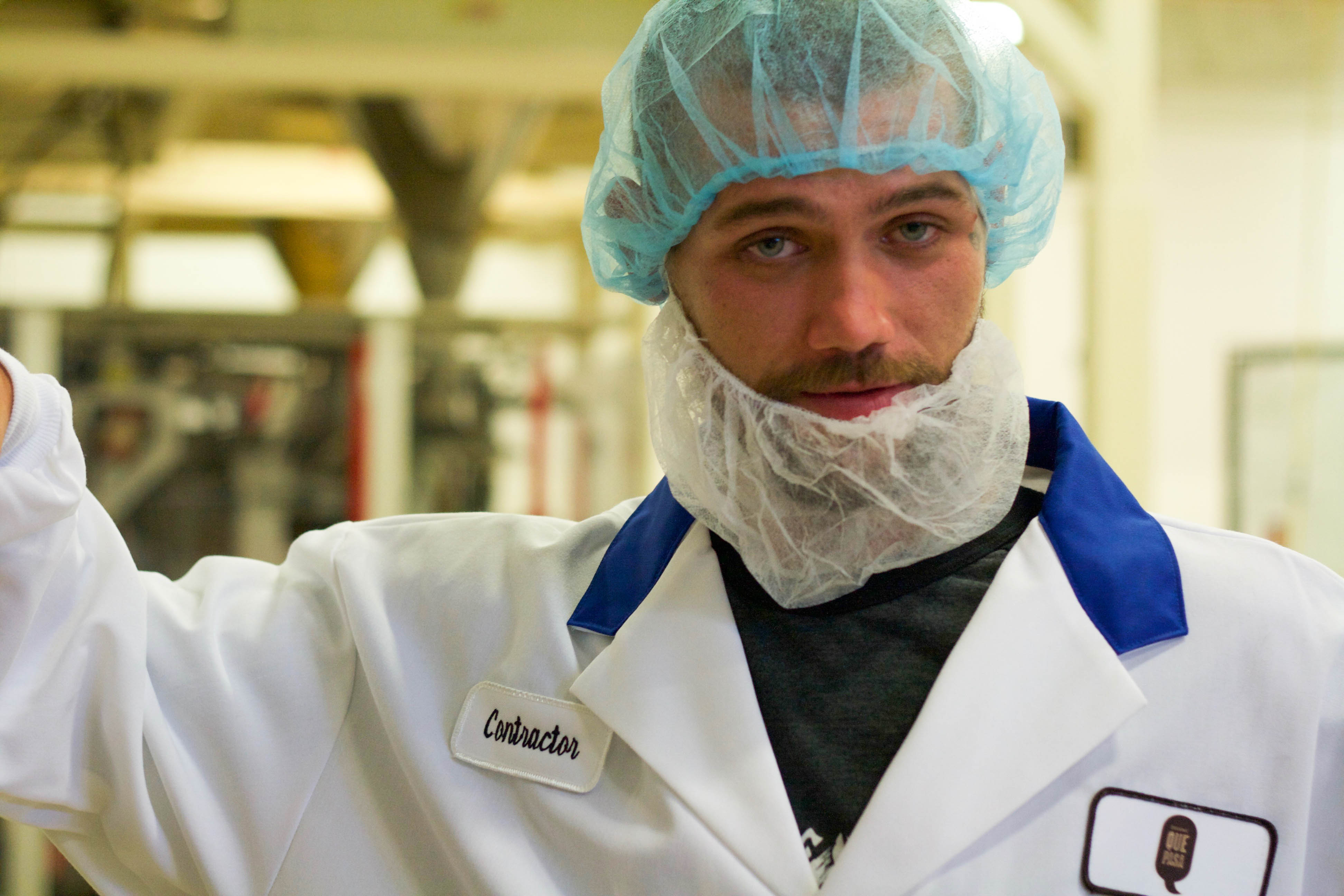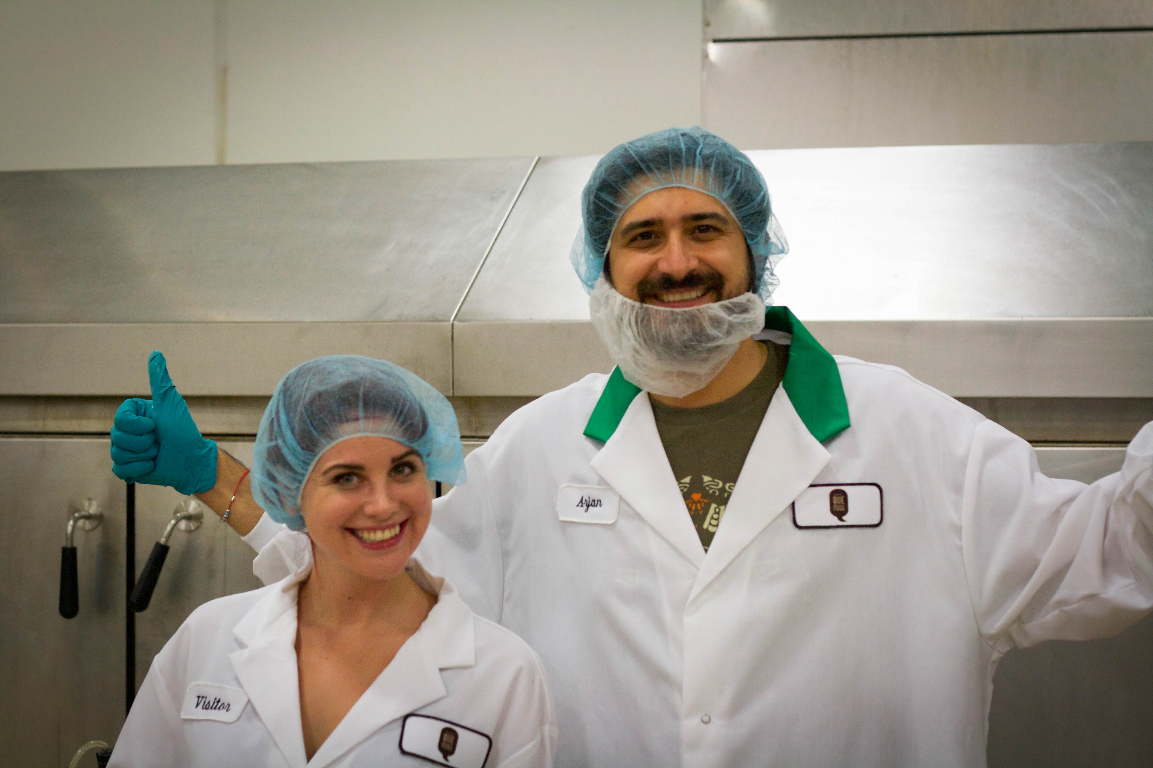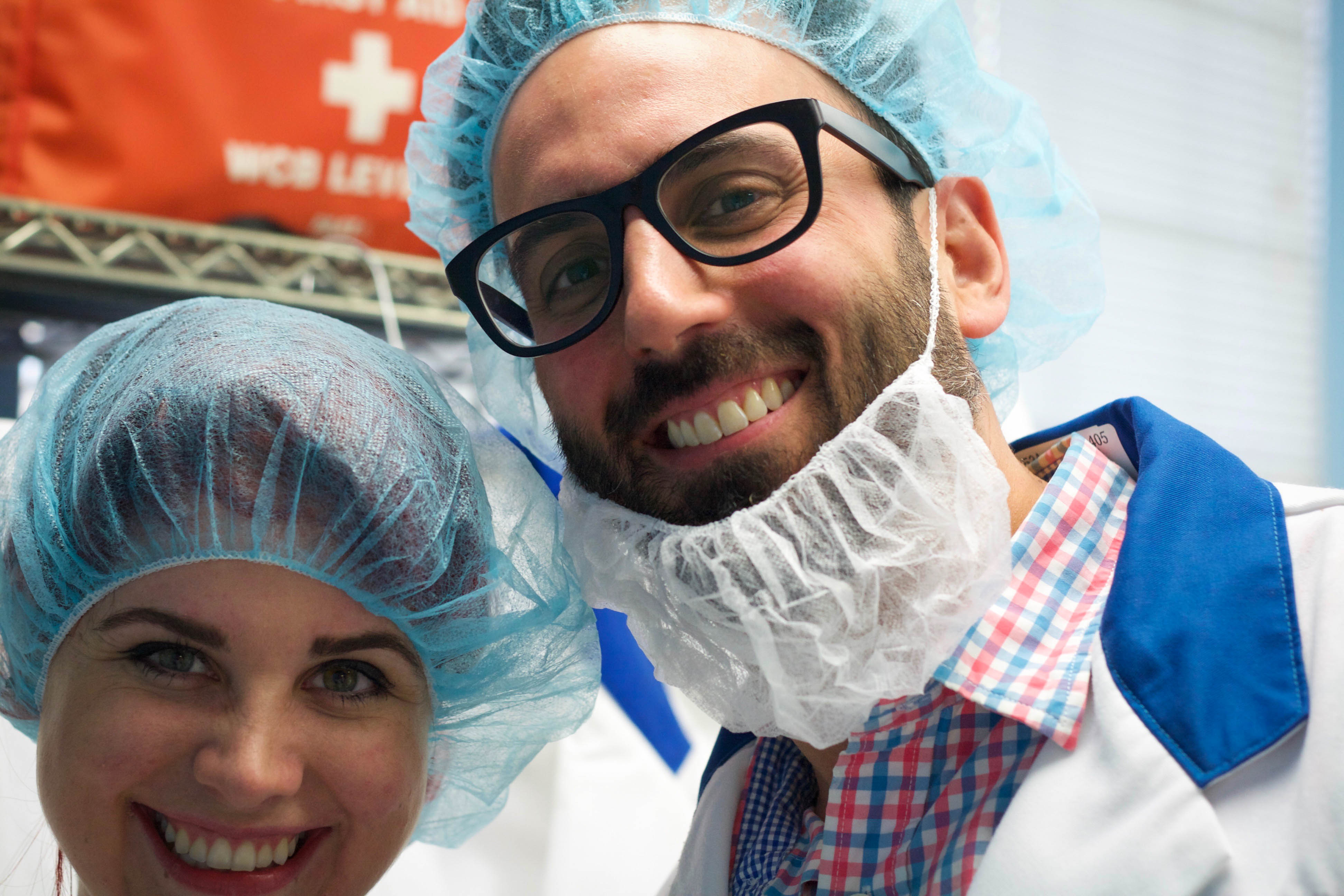 Ethan of Food Bloggers of Canada and I in our nifty factory outfits