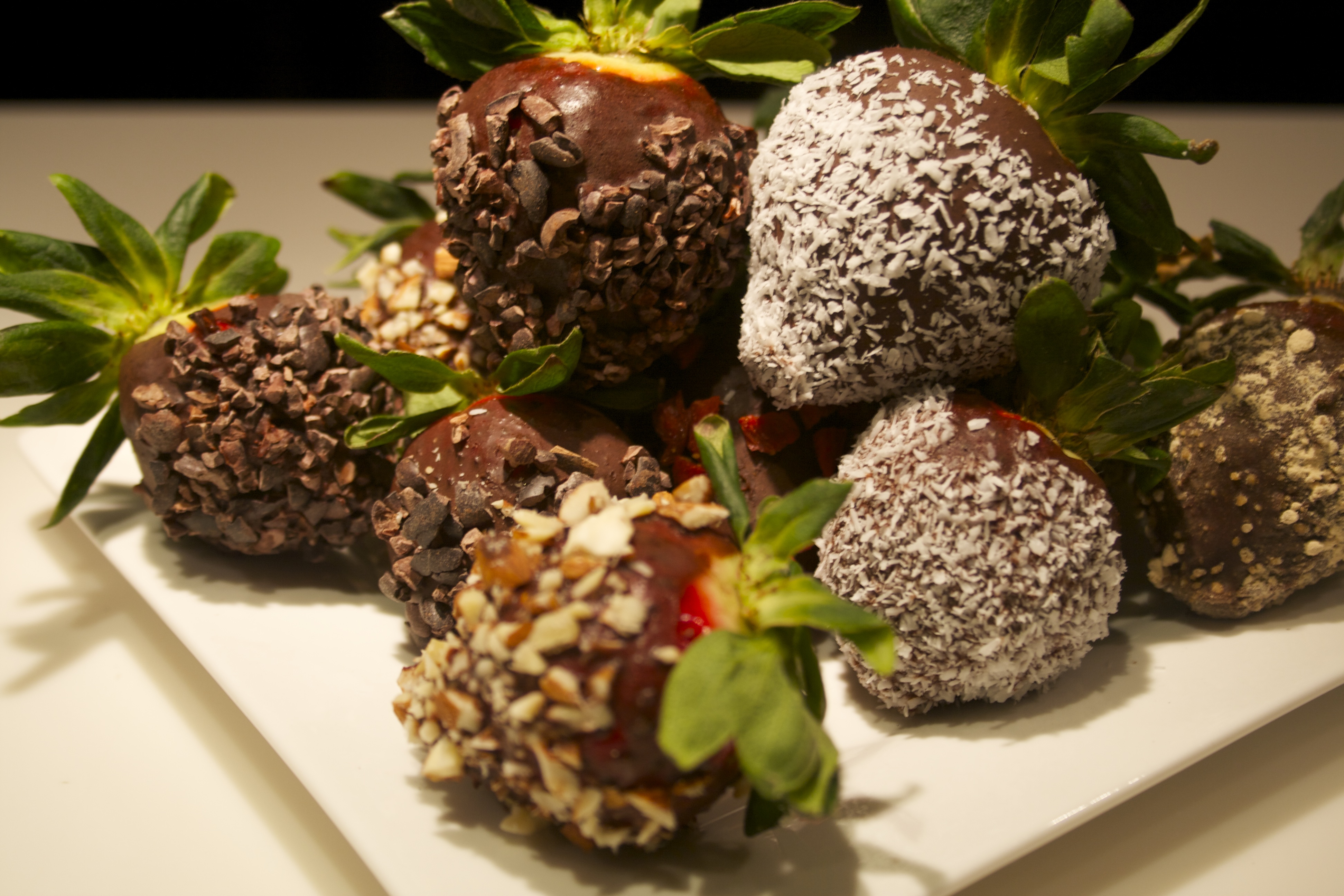 Mouth-watering strawberries dipped in decadent raw, dairy-free chocolate and rolled in superfood toppings like hemp seeds, goji berries, coconut, cacao nibs, and almonds.